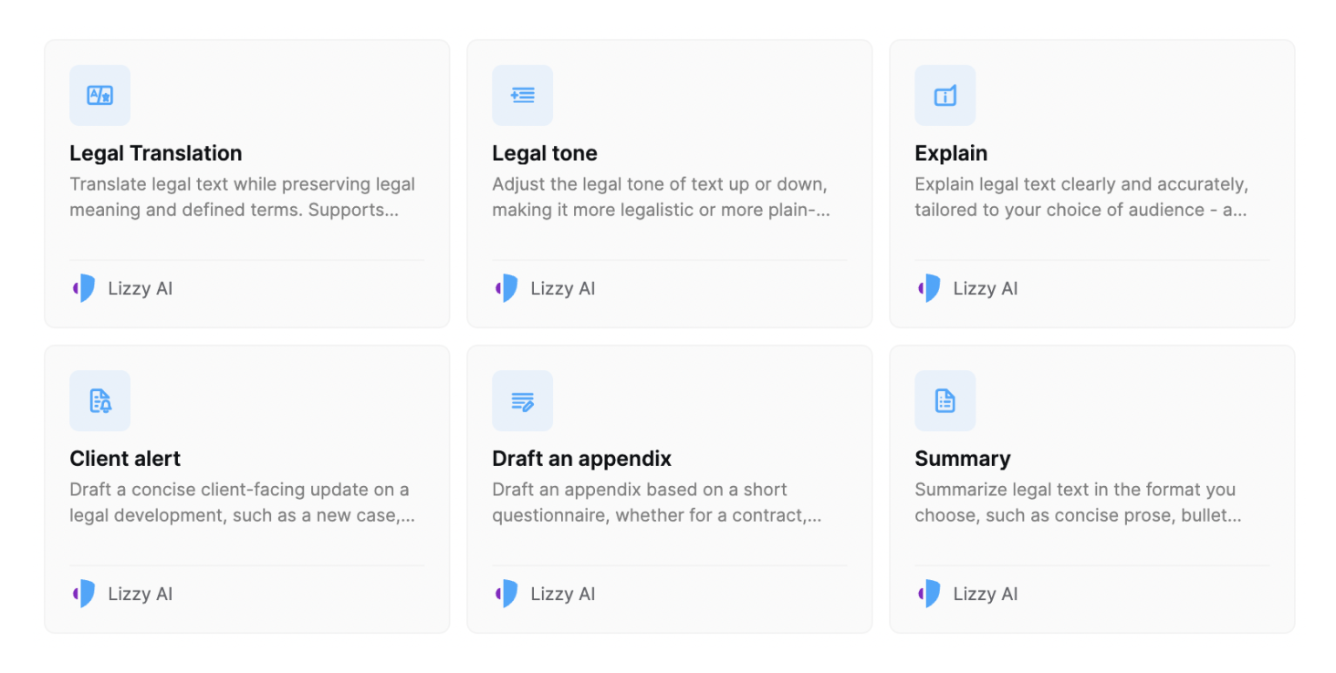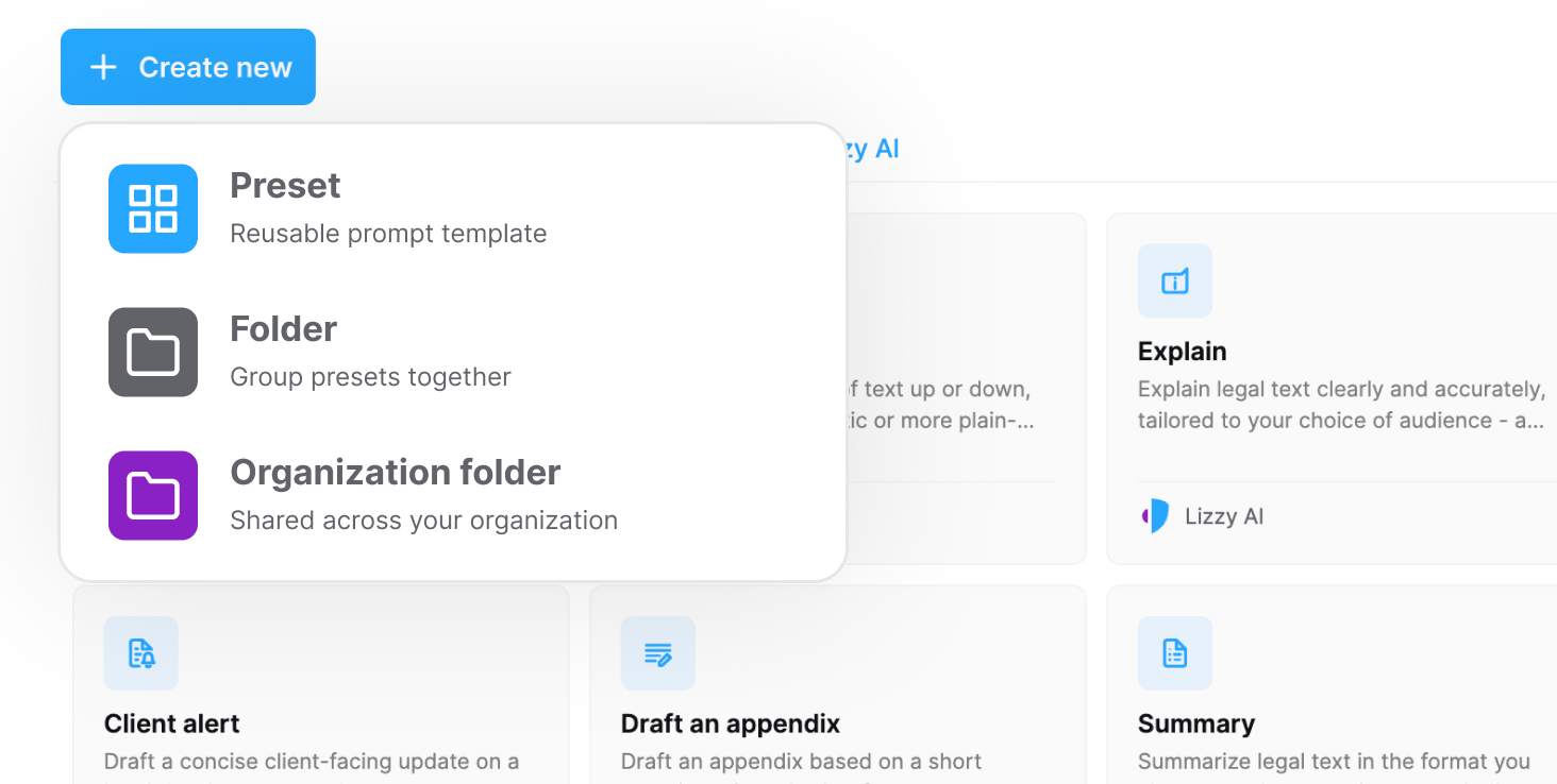 Presets are at the core of how work gets done in Lizzy. They allow you to run reusable workflows, automate repetitive tasks, and standardize how legal work is performed. This update focuses on improving how you browse, organize, and create presets.